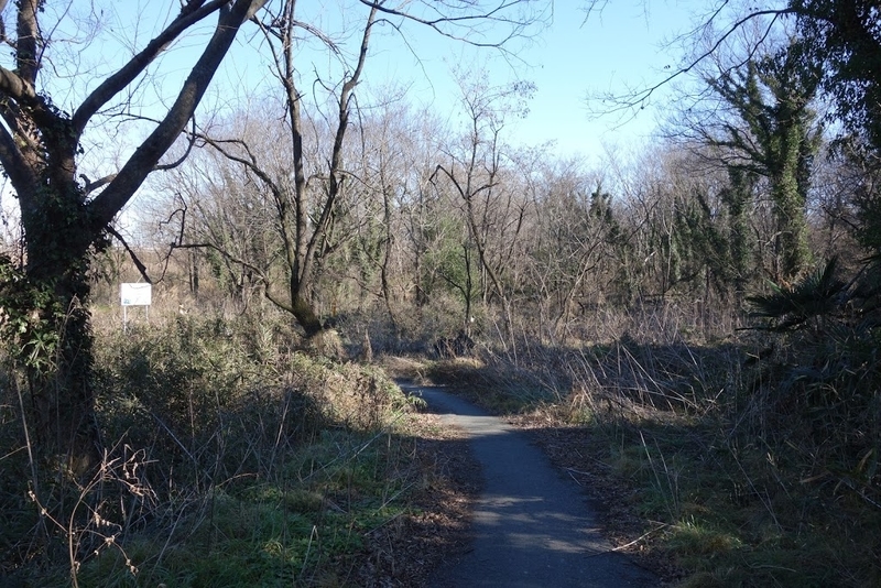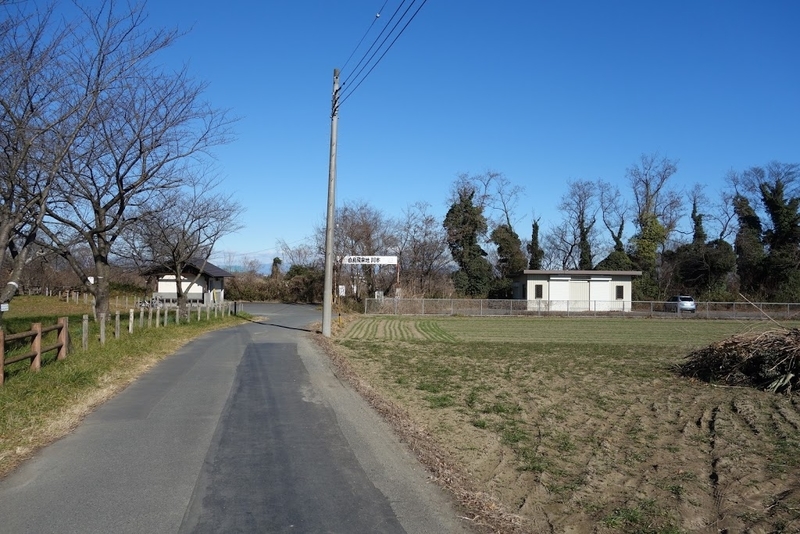 鹿島古墳公園の東端。左奥がロウバイの林。右は駐車場。正面の看板には「白鳥飛来地 川本□道」とあった。