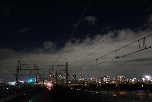 京葉線の新木場駅ホームの東京駅寄りの先端から。 すぐ先の鉄橋で湾岸高速を越え、運河の上の橋を右へと進み潮見駅へ。 周囲に建物がなく、下りの電車の先頭は潮見駅を出発するところからずっと目で追うことができる。 ビル街の夜景をバックに流れてくる窓の…