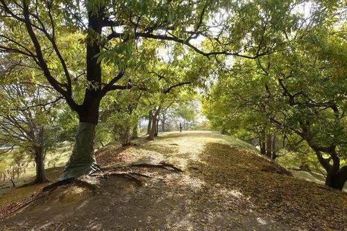 雄略天皇陵古墳(島泉丸山古墳・島泉平塚古墳)の周囲を歩いた後は、900mほど北東の津堂城山古墳へ。 前方部先端近くのコインパーキングに停めて、古墳公園内へ。 周溝も含めた盾形の広いエリアが整備・公開されています。 前方部の先端側。「城山」の名のと…