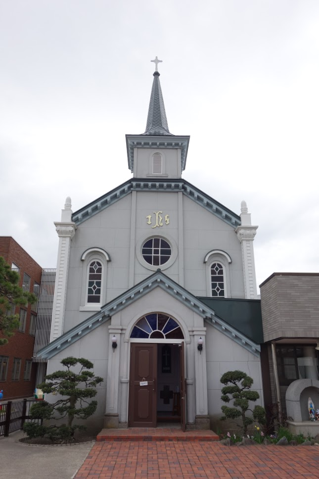 現在の教会堂は明治43年(1910)、オージェ神父の設計を堀江佐吉の弟、横山常吉が施工しており、木造モルタル平屋建の小規模なものだが、優美な尖塔、外壁左右の柱型、軒先の尖型装飾や開口部のロマネスク半円アーチなど、ロマネスク様式を取り入れた華麗な建物である。