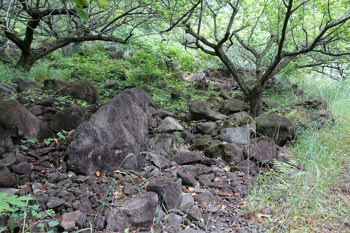 まずは斜面の上方に向かいます。小径の脇にも積石塚。