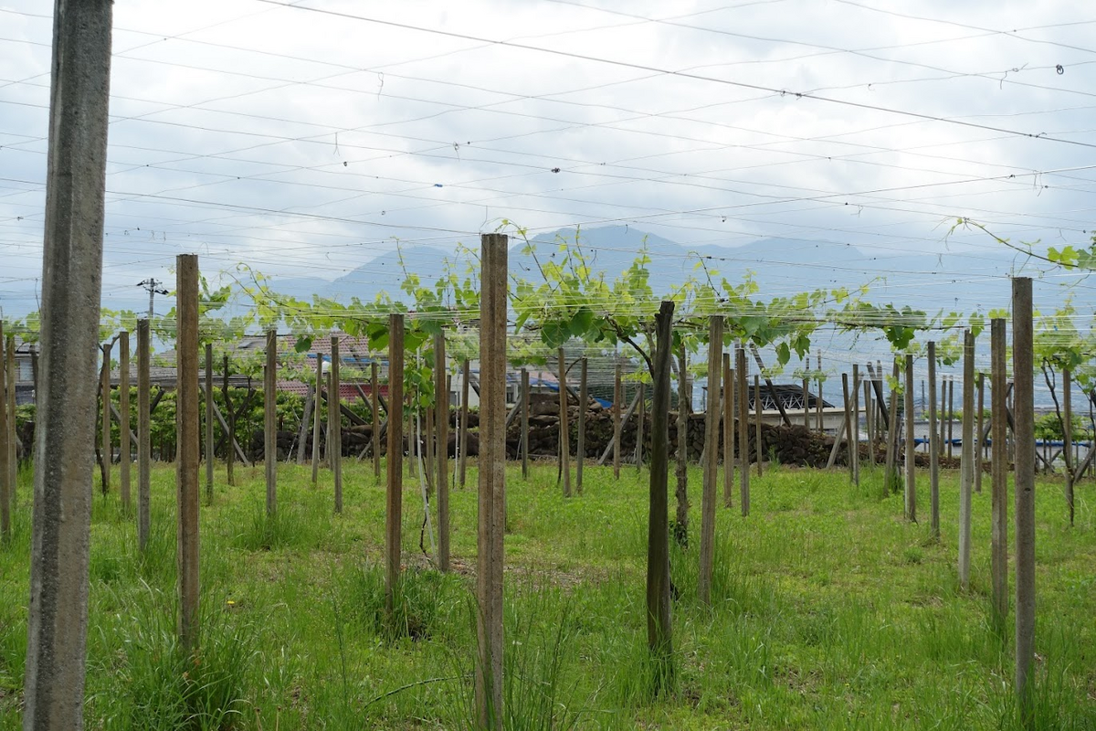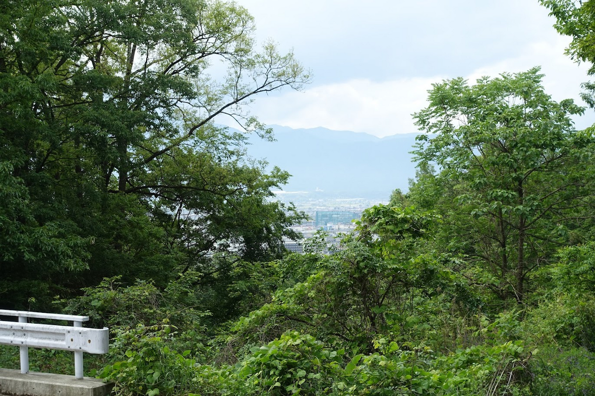 帰り際の道路から、ちらりと見えた甲府盆地。木々が無ければ富士山まで望めそうですね。
