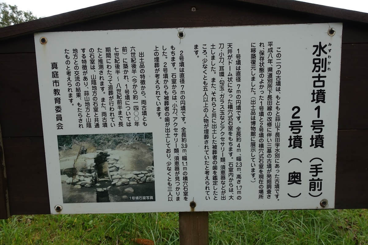この二つの古墳は、もともと蒜山下長田字水別にあった古墳です。平成8年、県道別所下長田線の改修に伴い三基の古墳が発掘調査され、保存状態のよかった1号墳と2号墳の横穴式石室を現在の場所に移築復元しました。(出土品は博物館に展示しています)1号墳は直径7mの円墳です。全長約4m、幅2.3m、高さ1.7mの天井がドーム状になった横穴式石室をもちます。石室内からは、大 刀・小刀、耳環・勾玉・ガラス玉などアクセサリー類、須恵器などが出土しました。 また、それらと共に出土した被葬者の歯を鑑定したところ、少なくとも5人以上の人物が埋葬されていたと考えられています。