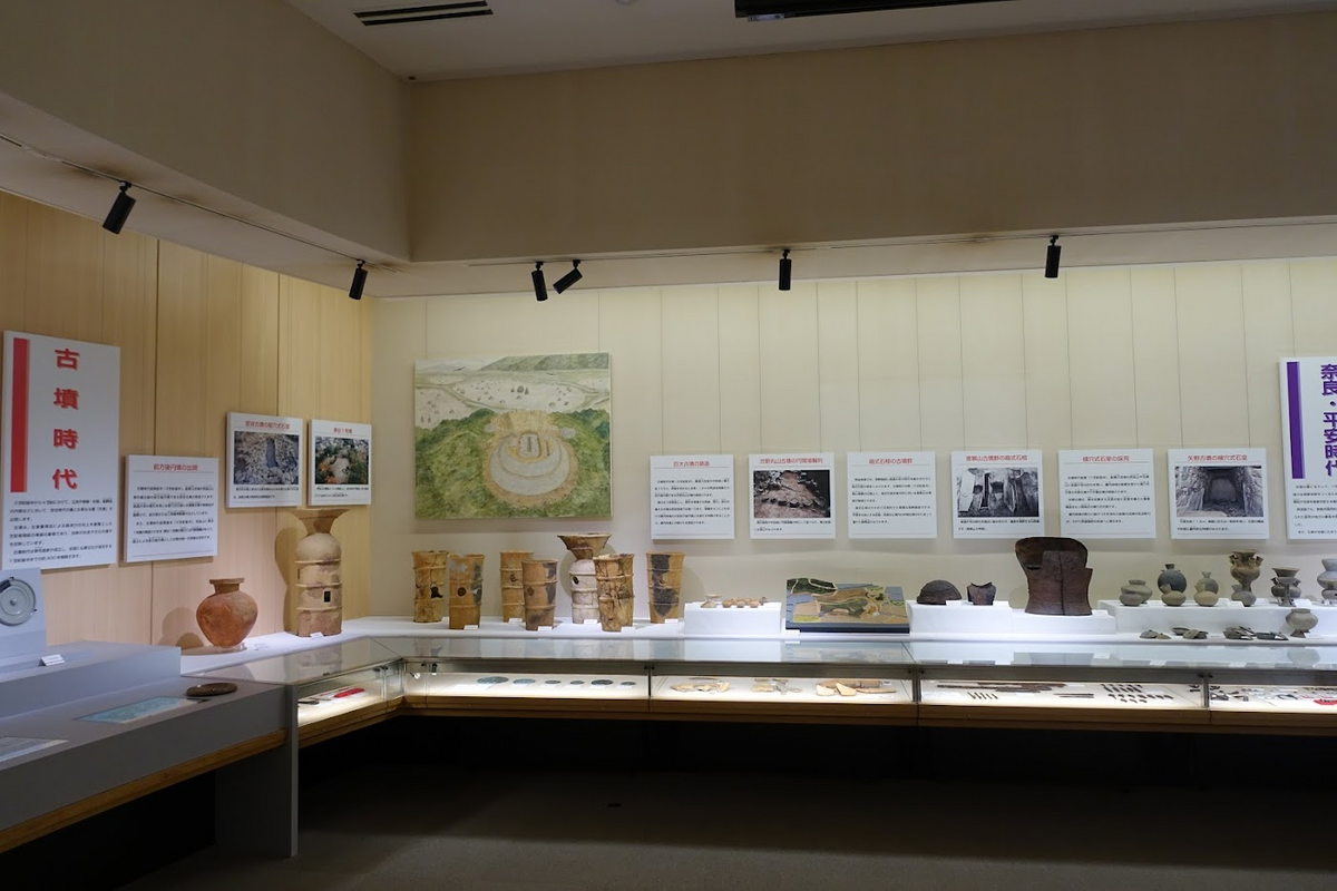 渋野丸山古墳の模型の右には、恵解山(えげやま)古墳群の出土品。