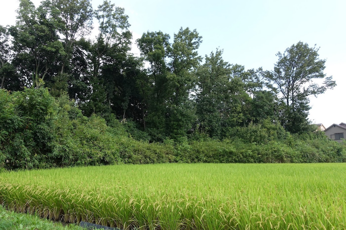 南に回り込むと水田が。中央奥がくびれ部のようです。