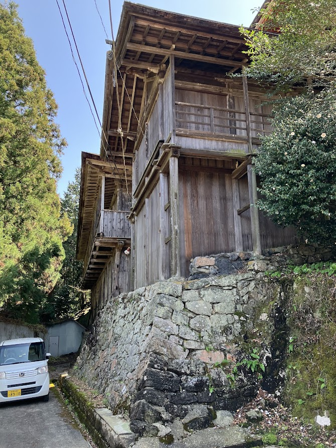 階段の上の社殿は中庭を囲むコの字のプラン。鳥居に向かって左(北東)側は石垣の上に木造の壁が。