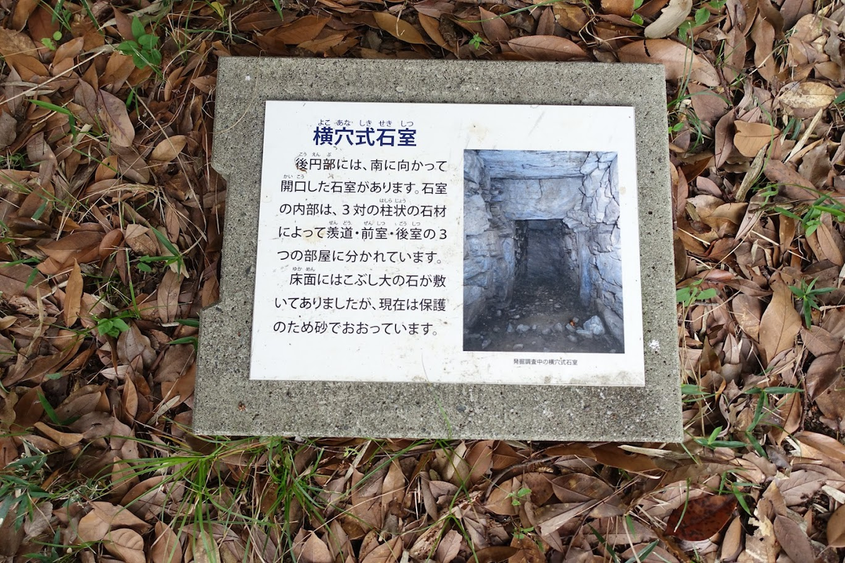後円部には、南に向かって開口した石室があります。石室の内部は、3対の柱状の石材によって羨道・前室・後室の3つの部屋に分かれています。