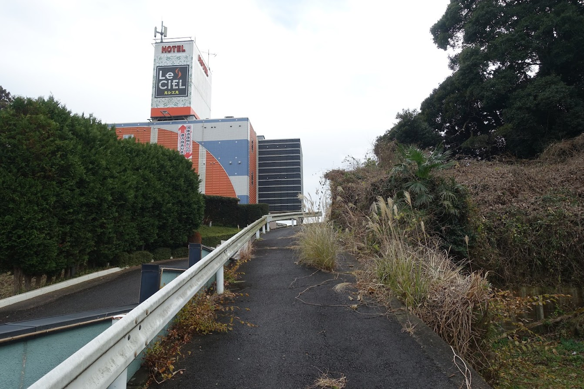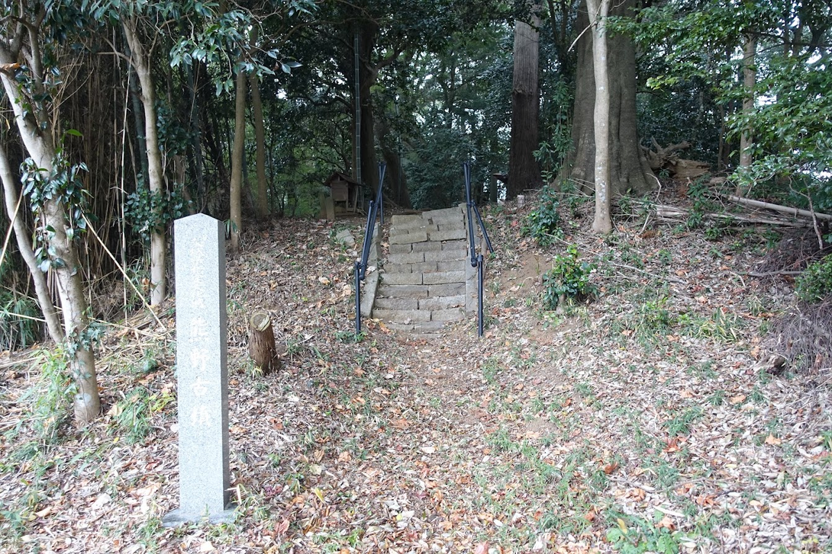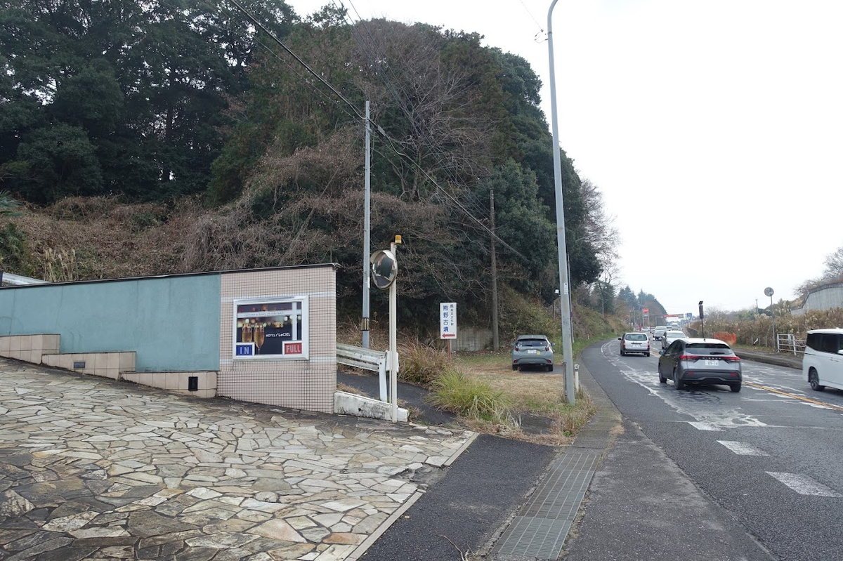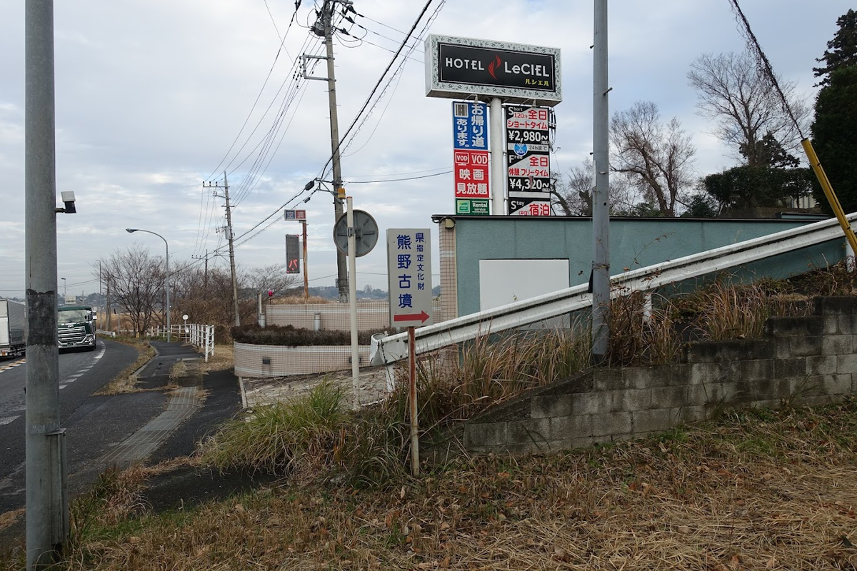 すぐ先に常磐道の千代田石岡ICもあって交通量の多い幹線道路の国道6号沿い。ラブホテル入口の隣に古墳のサインがあります。駐車場無しですが、看板の先に停めさせていただきました。